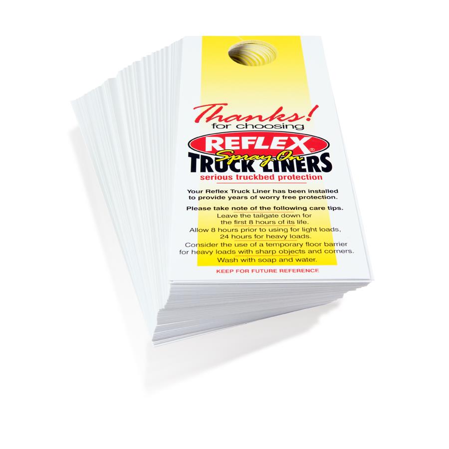 Hang this Reflex rear view mirror tag after completing a Reflex bedliner. Includes care tips for the new bedliner. Dealer imprint area included on back side.